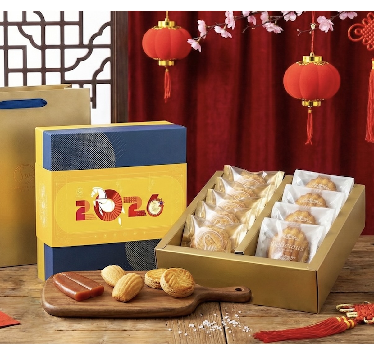 清新果香的法式檸檬瑪德蓮蛋糕,搭配濃郁鹹香的烏魚子布列塔尼酥餅,帶來雙重享受。這份跨文化的融合,將法式甜點的優雅與台灣海味的厚實結合,展現獨特的節慶風格。金色提袋設計更寓意「金饗」與「福氣」,是年節送禮與團聚分享的首選。